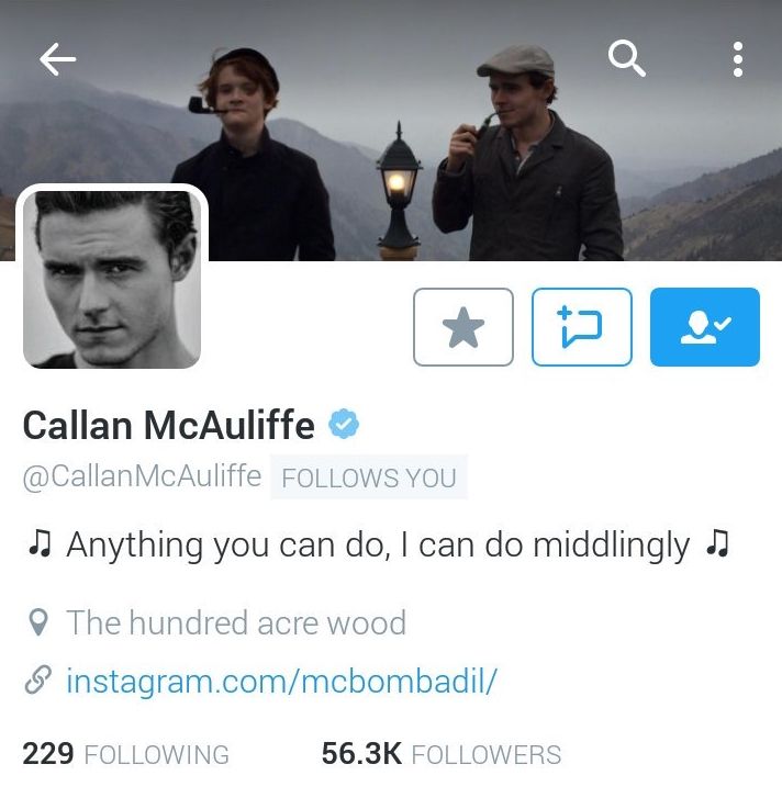 Callan McAuliffe เป็นผู้ชายที่เราเจอแล้วให้ความรู้สึกอยากเป็นเพื่อนเขามากกว่าเป็นแฟนคลับ เราชอบที่sense of humour เรากับเขาเข้ากันได้ดีมากๆ มากจนน่ากลัว 5555 เขาบอกว่าเราอะ "You spend too much time on the internet." แต่ก็บอกว่าไม่เป็นไรนะ เราสองคนก็ don't have a life พอๆกันแหละ ไปพูดถึงให้ปวดหัวทำไมกัน