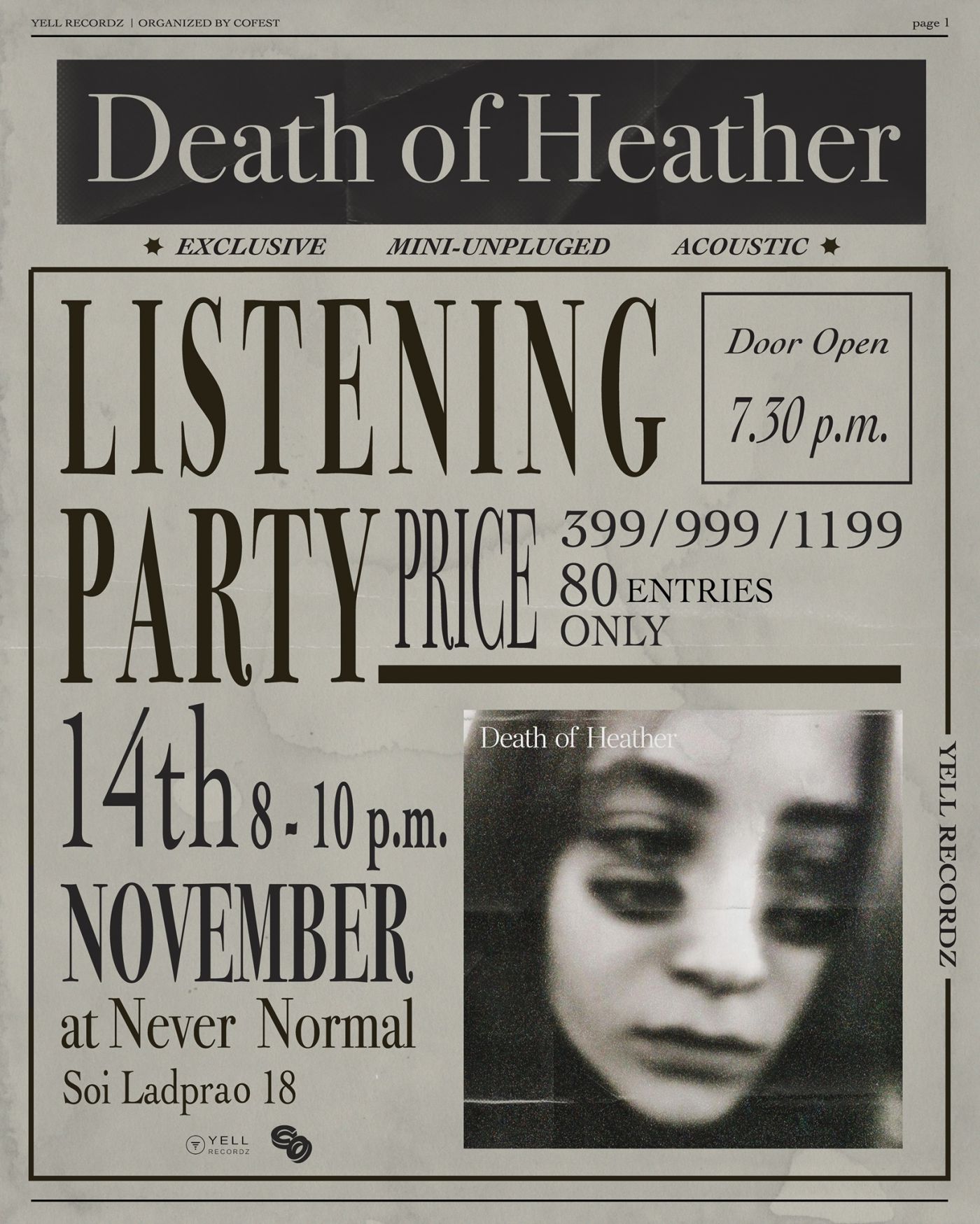 เต๊ะ : ถ้าถามว่าคุณจะได้อะไรจากการอัลบั้มชุดนี้เหรอ คุณจะได้รู้ว่า วงดนตรีวงนี้ มันไม่ได้มีแค่เพลงช้า ไม่ได้มีแต่เพลงดาวน์ๆ ผมหวังว่าเพลงในอัลบั้มของผมมันจะเป็นซาวน์แทร๊คประกอบชีวิตของใครสักคนได้ สำหรับคนที่แบบ….ต้องลองฟังดูอะ หวังว่าทุกคนจะได้รู้ว่า Shoegaze ไทยแม่งยังมีอยู่ ถึงเราไม่ได้เรียกตัวเองว่าเป็นวง Shoegaze แบบ 100% เป็นวงอัลเทอร์เนทีฟร๊อกธรรมดา แต่ว่าเราใช้อิทธิพลที่ได้จากการฟังเพลง Shoegaze จาก Dream Pop และเราก็พยายามเต็มที่มากที่จะเอาสิ่งที่เราชอบมาผสมผสานใส่ลงไปในเพลงของพวกเรา เราคิดว่าถ้าคนที่ชอบฟังเพลงแนวนี้จะต้องชอบ ไม่มากก็น้อย เพราะขนาดตัวผมเองในฐานะที่เป็นคนฟังเพลง ผมก็ยังรู้สึกว่าผมชอบเพลงวงผม คนที่ฟังแนวนี้ถ้าเขาได้มาฟังอัลบั้มนี้เขาจะไม่ผิดหวัง คนที่ยังไม่เคยฟังก็อยากให้ลองฟัง ไม่ต้องไปตั้งใจนั่งฟังอะไรขนาดนั้นก็ได้ ทำอะไรก็ได้ในชีวิตประจำวันปกติ นั่งรถนั่งอะไร เปิดเพลงผมเข้าไป เพลงของ “Death Of Heather” เหมาะการฟังระหว่างเดินทางมาก ถ้ามีรถ อยากให้ลองขับรถไปแล้วฟังอัลบั้มชุดนี้ไปเรื่อยๆ มันเหมาะกับการเดินทางมากๆ หรือว่าถ้าอยากจะลองตั้งใจนั่งฟังจริงๆ มันก็ได้ คุณก็จะได้รู้ว่าคอนเซ็ปต์และเรื่องราวในอัลบั้มนี้มันเป็นยังไง ทั้งๆ ที่มันไม่ได้ตั้งใจจะให้เป็นคอนเซ็ปต์หรอก แต่นบังเอิญที่แบบว่า มันเป็นเรื่องราวของแต่ละเพลงมันต่อกันจริงๆ แล้วพอเราเอามาเรียงเป็นอัลบั้มแล้วเสือกเป็นคอนเซ็ปต์ ถ้าอยากนั่งตั้งใจฟังมันก็ได้ แต่ถ้าฟังเพลินๆ ก็เพลินแน่นอน เป็นอัลบั้มที่เป็น Music For Cars อัลบั้มหนึ่งเลย แต่อย่าง่วงก็พอเท่านั้นเอง (หัวเราะ) มันหลับได้ ลองคิดภาพขับรถบนทางด่วน ไฟสลัวๆ แล้วเปิดเพลงของ “Death Of Heather” ตอนนั้นคงจะเหยียบ 120 ไปแล้วพอถึงเพลงช้าก็เริ่มขับช้าลงมองไฟถนน มันเป็นเพลงที่เหมาะแก่ฟังบนรถ ไปๆ มาๆ ผมจะตั้งชื่ออัลบั้มนี้ว่า “Music For Cars” ซะละ (หัวเราะ) ไอ้เหี้ยแม่ง The 1975