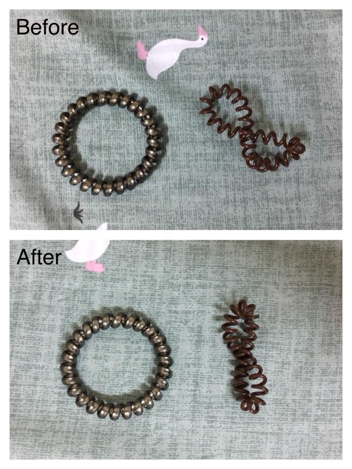 Figure2 - อันซ้ายคือยางปกติ ราคา 10 บาท อันขวาคือ invisibobble (ทำไมมันบิดไม่รู้ ไม่เข้าใจเหมือนกัน) ภาพบนคือก่อนแช่น้ำอุ่น อันล่างคือหลังแช่ จะเห็นว่าอันซ้ายนี่ไม่เปลี่ยนแปลงเลย แต่อันขวาหดลงนี้ดดดดนึง (เทียบสเกลกับน้องเป็ดเอาละสรุป