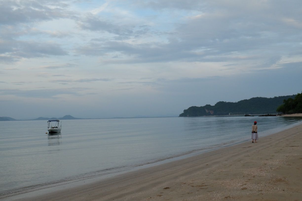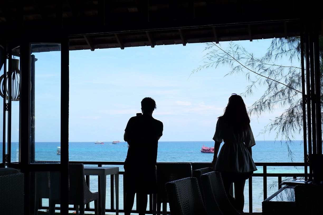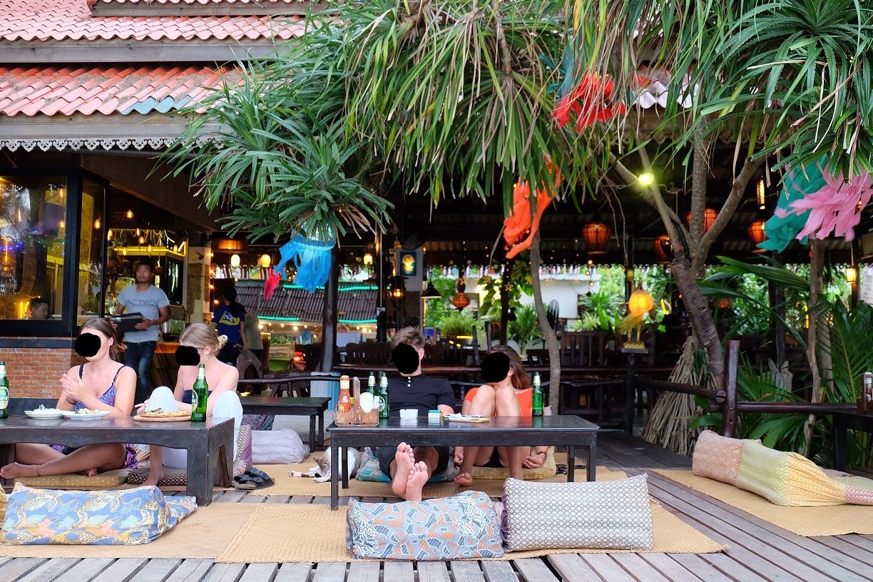 พอกลับลงมาก็เอามอไซค์ไปคืน แล้วเดินตามถนนเส้นเล็กไปหาร้านกินกัน ไปจบอยู่ที่ร้านนึงบรรยากาศดี๊ดี เป็นโต๊ะญี่ปุ่น อยู่ริมทะเล ดูราคาแล้วก็ไม่แพง (สำหรับบนเกาะ) เลยเข้าไปกินกัน น้ำมะพร้าวกับน้ำส้มไม่ค่อยอร่อย น้ำแตงโมใช้ได้ สเต๊กเหนียวไปหน่อย ข้าวไก่ผัดซอสเห็ดอร่อยดี แต่ถ้าเปลี่ยนจากข้าวเป็นสปาเก็ตตี้น่าจะดีมาก