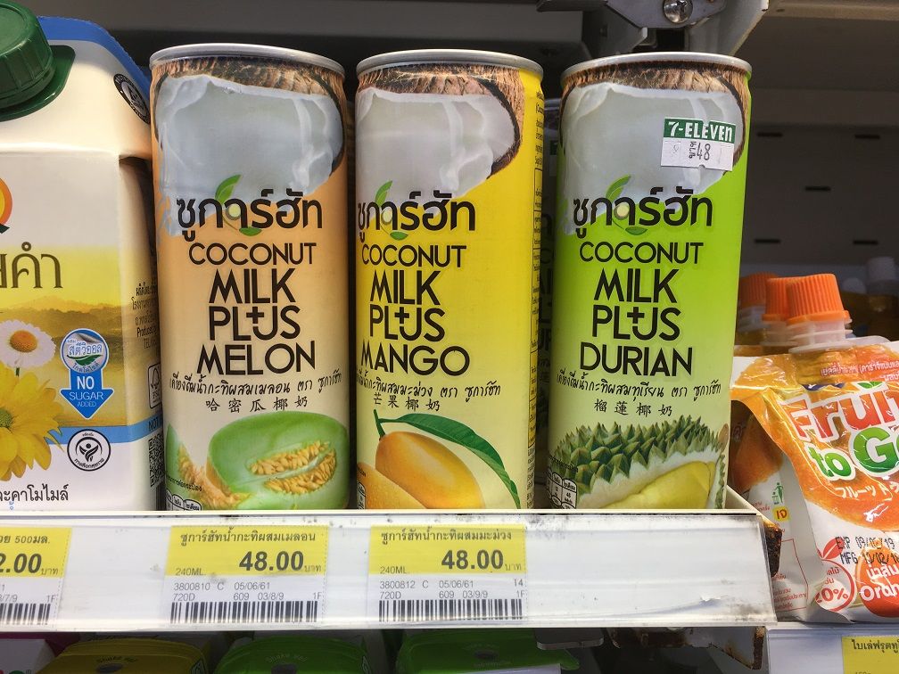 นั่งไปไม่นานก็ถึงรีสอร์ท เราก็วางกระเป๋าไว้แถวที่ลงรถนั่นแหละ แล้วเดินลงไปที่ reception ซึ่งอยู่ติดหาด ไปเช็คอิน พี่พนักงานบอกรอประมาณ 30 นาทีนะคะ กำลังทำห้องอยู่ ระหว่างรอก็เดินเล่นแถว ๆ นั้น คือรีสอร์ทอะกว้างม้ากกกกกก มีถนนตัดผ่านรีสอร์ท 2 เส้น เส้นแรกคือถนนหลักที่เรานั่งรถมา กับอีกเส้นเป็นถนนเส้นเล็ก ๆ ได้แค่เดินกับขี่มอไซค์ อยู่ใกล้ ๆ ชายหาดและ reception เราเดินกันที่ถนนเส้นเล็ก (ห้ามเล่นมุกนะว่า แล้วถนนเส้นหมี่ล่ะ 555) เกือบติดรีสอร์ทเลยมีเซเว่น ราคาของก็มีทั้งที่เท่ากับบนฝั่ง และแพงกว่าบนฝั่ง ที่แพงกว่าก็มีตั้งแต่แพงกว่า 2-3 บาท ไปถึงเป็น 10 บาท และมีของที่ไม่เคยเห็นที่เซเว่นปกติด้วย เช่น น้ำ 3 กระป๋องนี้ 555 (ดูรูปข้างล่าง) อ่านชื่อก็ยี้แล้ว นึกถึงกะทิกล่องที่ไว้ทำอาหาร แต่เพื่อนก็แย้งว่าอาจจะเหมือนน้ำกะทิที่กินกับลอดช่องรึป่าว วันท้าย ๆ เราลองชิมกันให้มันรู้ไป เราลองน้ำเมล่อนกับน้ำมะม่วง เมล่อนตอนกินเข้าไปแรก ๆ ก็คล้าย ๆ นมเมล่อนปกติ แต่รสปลาย ๆ เหมือนยาน้ำ สรุปไม่อร่อย แต่น้ำมะม่วงใช้ได้อยู่ เหมือนข้าวเหนียวมะม่วงเวอร์ชั่นน้ำ 555 ส่วนน้ำทุเรียนไม่ได้ลองนะจ๊ะ ไม่ชอบทุเรียน ใครชอบก็มาลองโดนได้ 555