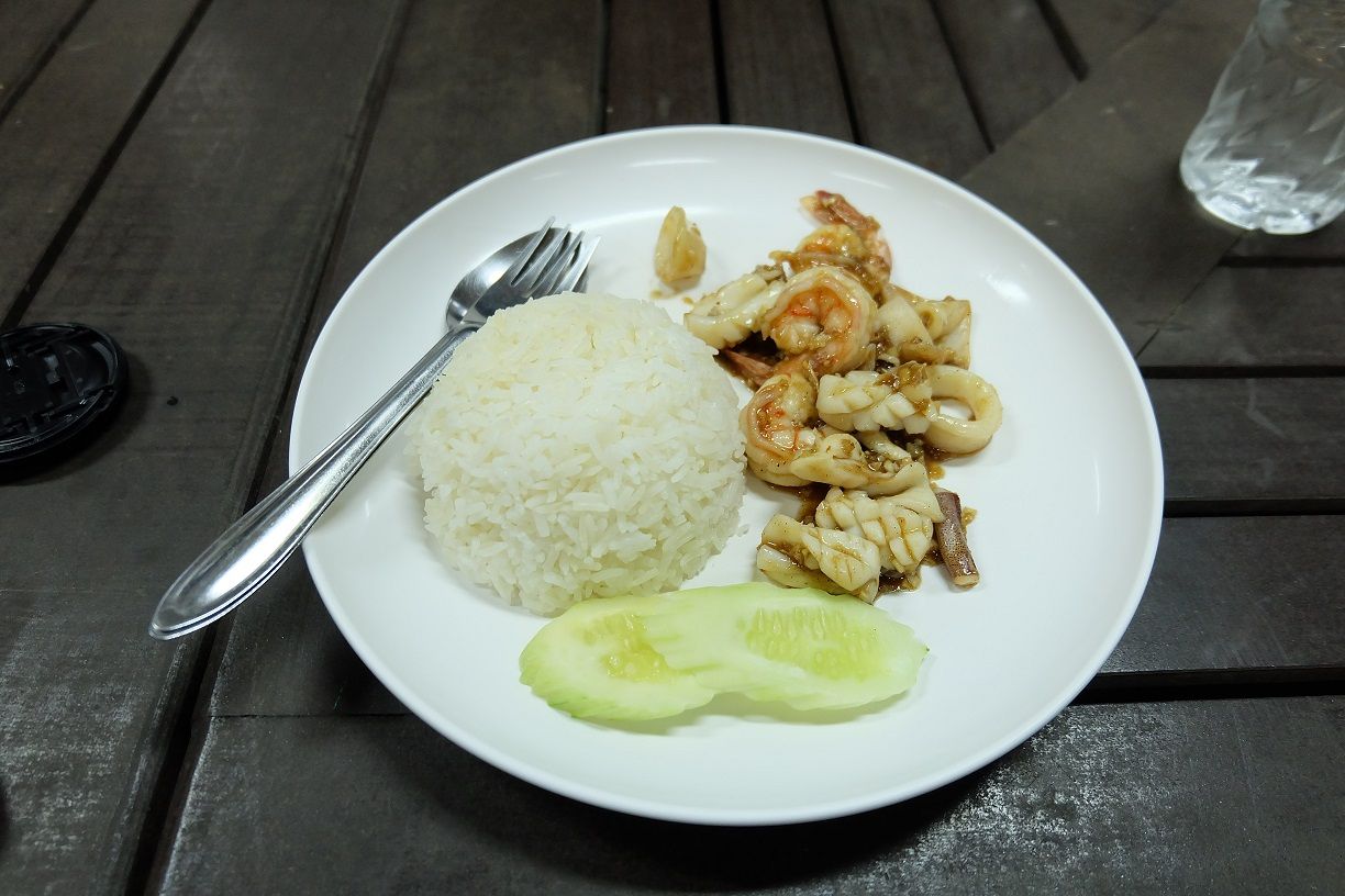 เราก็อาบน้ำแต่งตัวนอนพักซักเดี๋ยวแล้วก็ออกไปกินข้าวกันที่ร้านอาหารของรีสอร์ท อยู่ใกล้ ๆ กับ reception อาหารจานเดียวเริ่มต้นที่ 80 บาท แต่รู้สึกจะมี 80 อยู่อย่างเดียวเองมั้งคือข้าวผัด 555 ที่เหลือส่วนใหญ่ก็ 100 หน่อย ๆ