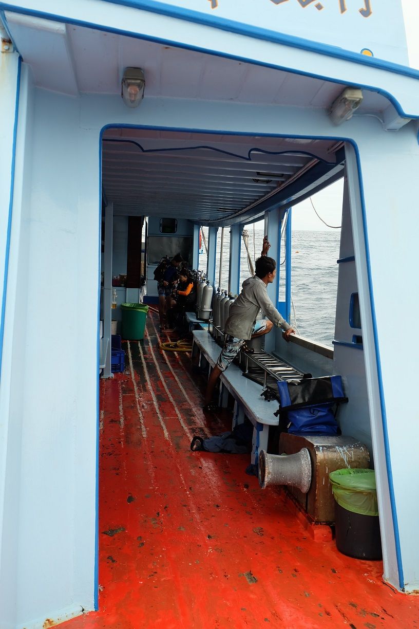 ปกติขึ้นผิวน้ำแล้วจะเอา mask กับ reg ออกก็ได้ แต่อันนี้ครูบอกเลยว่าให้ใส่ไว้เพราะคลื่นแรงมาก เรายังใช้ mask กับ reg ว่ายบนผิวน้ำไปท้ายเรืออยู่ ตอนขึ้นก็ขึ้นโคตรยาก โดนคลื่นซัดอยู่นั่น พอขึ้นมา ถอดอุปกรณ์แล้วก็ไปรวมกันดาดฟ้าเรือ รอบนี้ไม่มีคอมเมนต์แล้ว ทุกคนโอเค เลยคุยกันสนุกสนาน กินขนม ถ่ายรูปกัน แฮปปี้