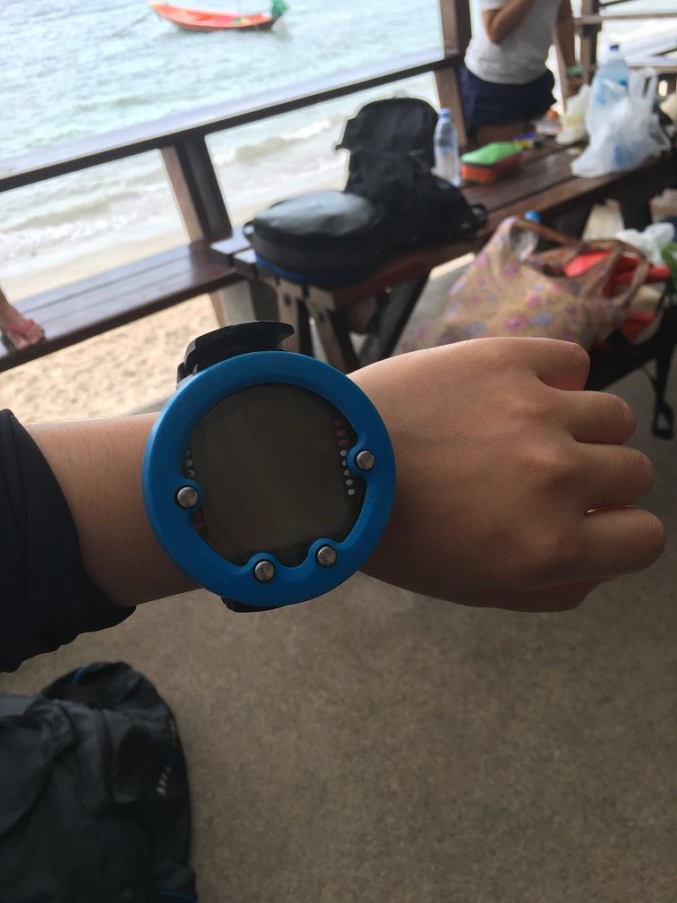 วันนี้มีอุปกรณ์เพิ่มด้วยคือ dive computer หน้าตาเหมือนนาฬิกาข้อมือเรือนใหญ่ ๆ เราไว้บอกระดับความลึก บอกเวลา คำนวนให้ด้วยว่าระดับความลึกนี้เราควรอยู่ได้นานสุดแค่ไหน แล้วหลังจากดำน้ำนานเท่าไหร่ถึงขึ้นเครื่องบินได้ (ถ้าดำน้ำแล้วขึ้นเครื่องบินโดยที่ยังมีไนโตรเจนค้างอยู่ในเลือดอันตรายนะคะ) แล้วก็มีเข็มทิศอีกอัน อันนี้ไม่ได้ได้ทุกคน จับคู่กันใช้ คู่เราบัดดี้เราใส่ เป็นคนหาทิศ แล้วเราเป็นคนนับก้าว (นับจำนวนการตีขานั่นแหละ) ครูสอนใช้ dive com กับเข็มทิศที่ริมหาดแล้วเราก็ไปขึ้นแท็กซี่กัน