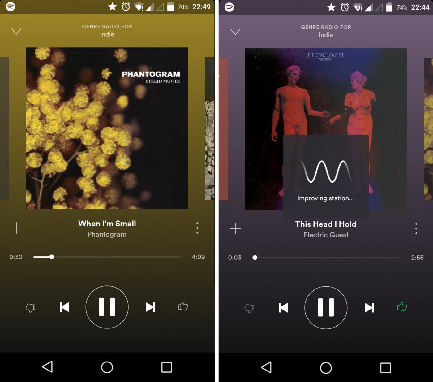 ในหมวดนี้ถ้าเราเข้าไปเลือกฟังในสถานีใดๆก็ตาม ในกรณีนี้เราเลือกสถานี Indie แล้วกดเลือกฟังเพลงใดก็ตาม มันจะมีเมนูเพิ่มขึ้นมาไม่เหมือนกับในเพลย์ลิสต์ค่ะ นั่นคือปุ่มซ้ายขวา จะเป็น Thumb down กับ Thumb Up ส่วนนี้ไม่ใช่การ Dislike ให้เรตติ้งตกแต่อย่างใด แต่เป็นฟังก์ชั่นในการฟังค่ะ คือ หากเราคลิ๊ก Down แอปจะจำไว้ว่าเราไม่ชอบเพลงแนวๆนี้ค่ะ และมันจะไม่พยายามใส่มาในเรดิโอเราอีก แต่เพลงไหนที่เรากด Up แอปก็จะพยายามหาเพลงแนวๆนี้มาแนะนำเพิ่มนั่นเอง ฟังกันนันสต็อปไปเลย ตรงนี้ไม่ใช่