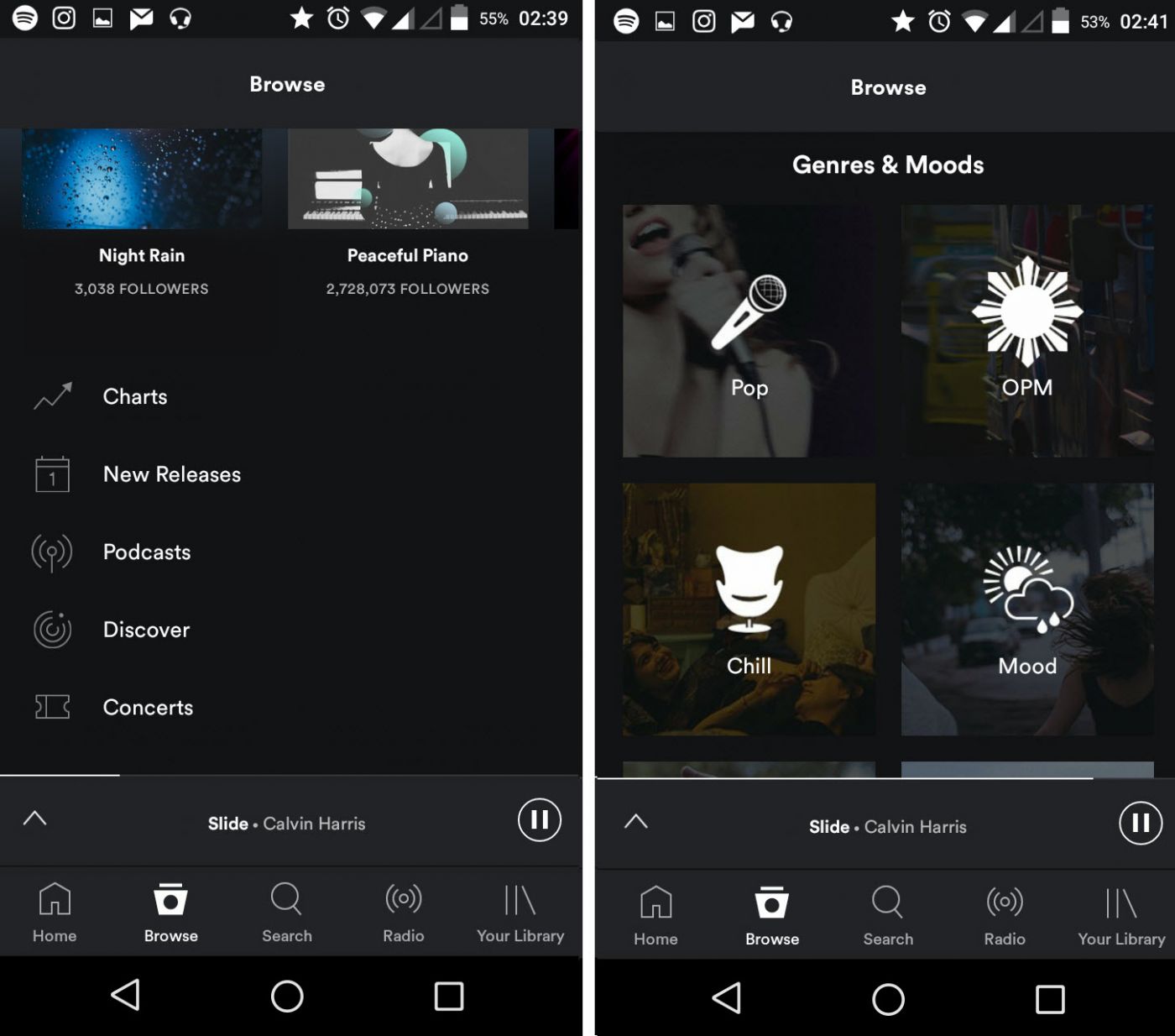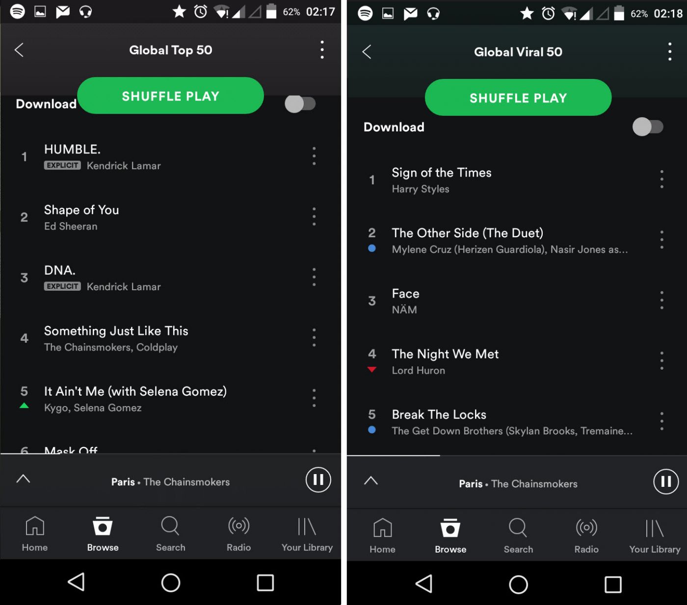 1. Chartsชาร์ตของ Spotify จะแบ่งเป็น Spotify Charts และ Viral Chart จากการสังเกตดูความแตกต่างของทั้ง 2 ชาร์ตคือ ชาร์ต Spotify จะเป็นชาร์ตเพลงที่คนฟังเพลงทั่วๆไปฟัง แต่ชาร์ต Viral คือเพลงที่เป็นที่พูดถึงเยอะในโซเชียลหรือเพลงใหม่มากๆ หรืออินดี้มากๆ ที่กำลังเป็นกระแส