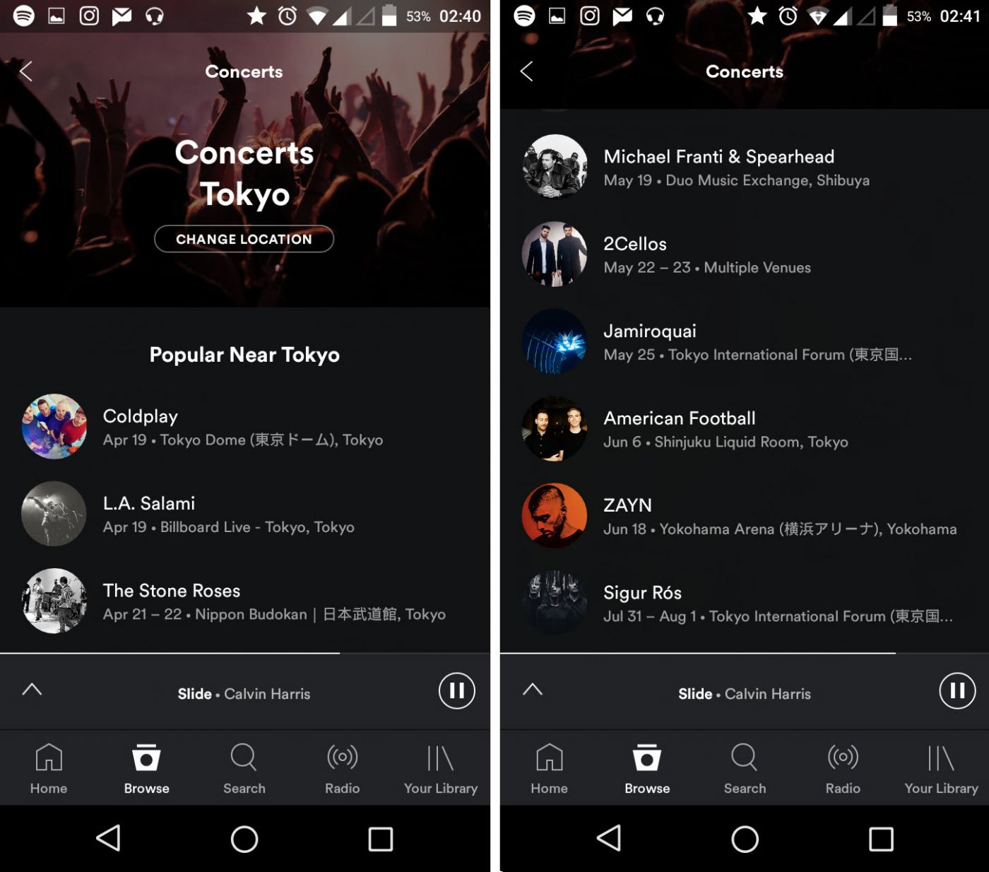 5. Concertจะมีการแนะนำวงที่จะมาจัดแสดงในประเทศนั้นๆ เฉพาะที่มีการรายงานถึง Spotify เท่านั้น (เพราะฉะนั้นบางวงก็อาจไม่เห็น) สามารถเปลี่ยน Location ได้ เช่นเปลี่ยนไปดู Tokyo,JP ก็จะมีลิสต์คอนเสิร์ตในญี่ปุ่นขึ้นมาให้ดู