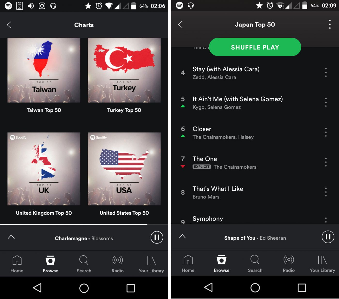 ชาร์ตที่หน้านี้จะละเอียดกว่าหน้า Home เพราะสารถเลือกดูได้ทุกชาร์ตของ Spotify ที่มีทั่วโลก (เฉพาะประเทศที่ใช้ Spotify) เมื่อเราเข้าไปที่หน้าชาร์ตละประเทศจะโชว์อันดับต่างๆและอันดับใหม่เก่าที่พึ่งเลื่อนขึ้นหรือตกลงด้วย