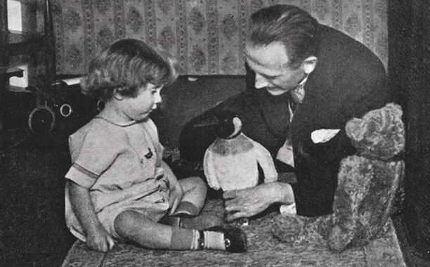 Christopher Milne (ต้นแบบเด็กชาย Christopher Robin) ซึ่งในภาพนั้นทั้งสองกำลังเล่นตุ๊กตาเพนกวินอยู่ ข้างๆ ก็มีตุ๊กตาหมีสีน้ำตาลซึ่งเป็นแรงบันดาลใจในการสร้างคาแรคเตอร์ของพูห์ผู้แสนอ่อนโยนอยู่ด้วย ซึ่งคาดว่าตุ๊กตานั้นก็คงเป็นตุ๊กตายัดนุ่นที่ Daphne Milne ผู้เป็นภรรยาซื้อมาจากห้าง Harrods นั่นเอง