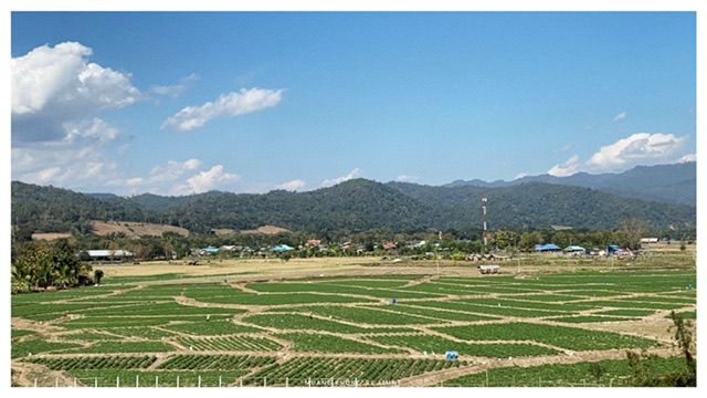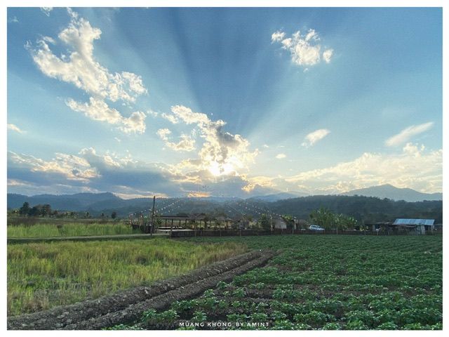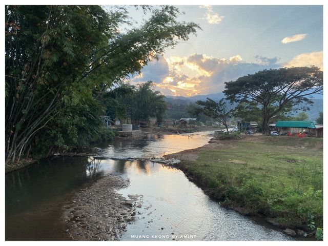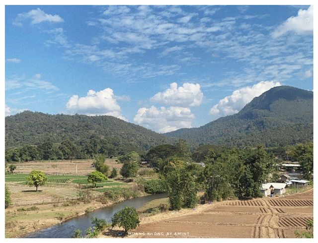 สองฝั่งเป็นทุ่งนา ฉากหลังเป็นภูเขาล้อมรอบ