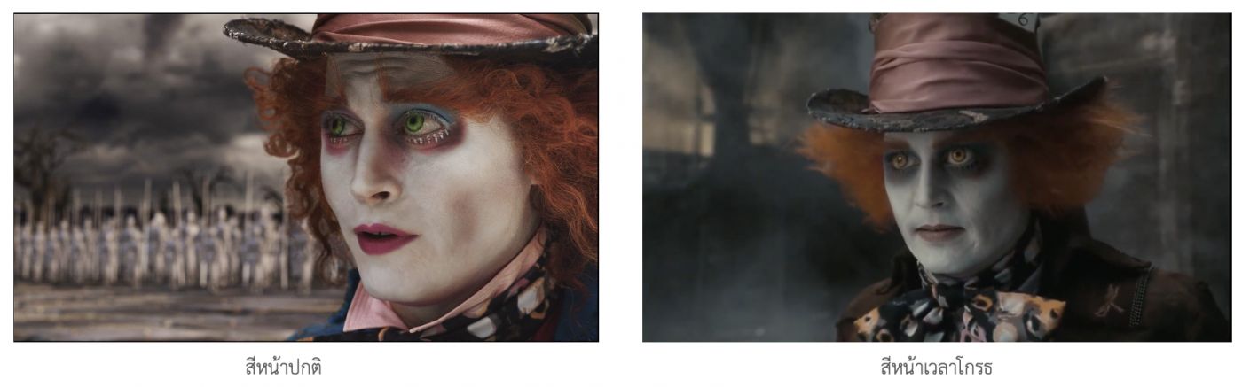 ในเรื่อง Alice in Wonderland มีการใช้โทนสีของภาพทำให้รู้สึกถึงความต่างของสถานที่ได้อย่างชัดเจน แม้โทนสีในเรื่องจะคงลักษณะเด่น คือ สีหม่น ก็ตาม อย่างในตอนที่อลิซยังอยู่ในโลกปกติของเธอ โทนสีของภาพจะเน้นไปที่ฟ้า เขียว ขาว ครีม ไม่มีสีที่ฉูดฉาด หรือโดดเด่นออกมาจากภาพ แต่เมื่ออลิซได้เข้าไปยังวันเดอร์แลนด์ สีของภาพถูกกดให้มืดมนมากยิ่งขึ้น แต่ว่าได้มีการเพิ่มสีที่ฉูดฉาดเข้ามาเพิ่ม เช่น สีแดง สีม่วง สีเหลือง นอกจากนี้แล้ว ในช่วงแรกของเรื่องจะเห็นว่ามีการใช้สีโทนฟ้า โทนน้ำเงิน นั่นยิ่งทำให้บรรยากาศของหนังในช่วงนี้ดูลึกลับ พิศวงให้ดูมีความเป็น Dark Fantasy ด้วยโทนสี และให้ความรู้สึกเหมือนที่อลิซกำลังรู้สึกอยู่เมื่อเจอกับสิ่งที่แปลกประหลาดไป