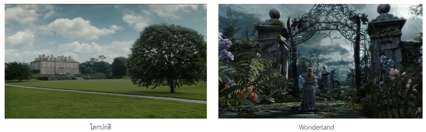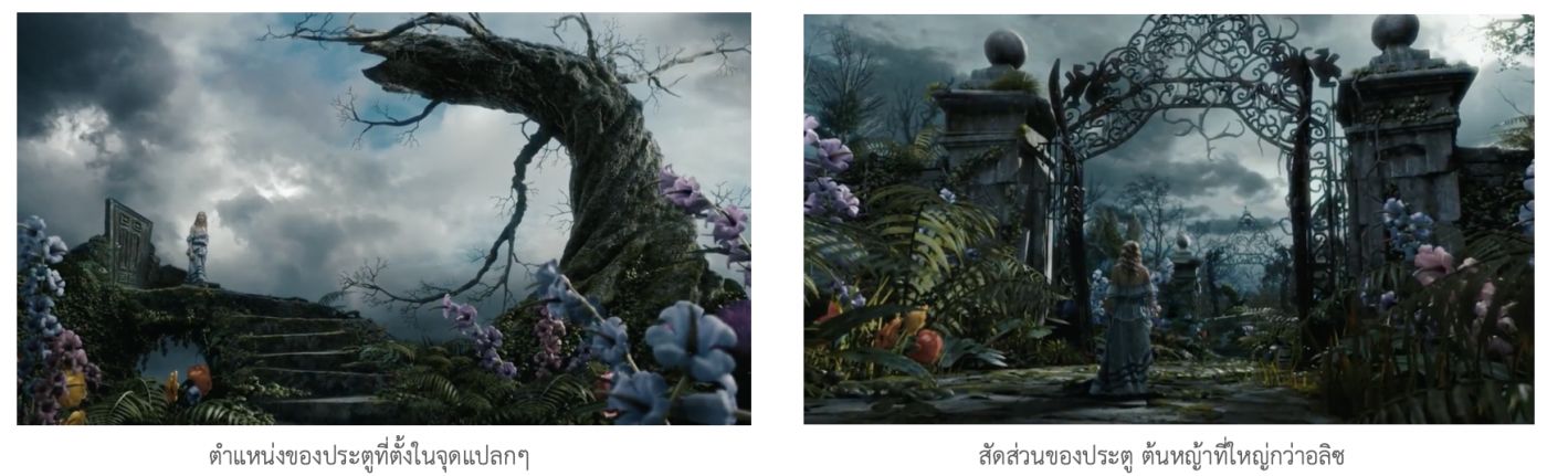 จากรูปภาพที่ยกตัวอย่างขึ้นมาจะเห็นถึงความแปลก ภาพแรกที่มีประตูอยู่อลิซเดินออกมาจากประตูบานนั้น แต่ด้านหลังกลับไม่มีอะไรอยู่เลย ภาพต่อมาคือสัดส่วนของประตูและต้นหญ้าที่ใหญ่กว่าขนาดตัวของอลิซ ที่ปกติแล้ว อลิซที่เป็นมนุษย์จะมีขนาดใหญ่กว่าหญ้าและประตูจะใหญ่กว่าตัวไม่มาก แต่ในวันเดอร์แลนด์ สิ่งนี้กลับตรงกันข้าม