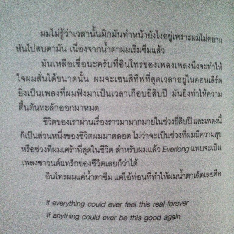 การเดินทางมาเพื่อชมวงนี้เล่นสดสักครั้ง เหมือนจะดูไร้สาระมากเลย แต่นั่นแหละ มันเป็นเป้าหมายที่ทำให้เราเดินทาง แม้เป้าหมายจะเล็กน้อยแต่ก็ทำให้เราอิ่มใจ และแม้ว่ากลับมาแล้วเงินในบัญชีเราจะคงเหลือนไม่ถึง 10 บาทก็ตาม ดังที่ แพท บุญสินสุข ได้เขียนไว้ในหนังสือ