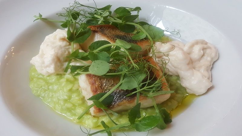 Roastedfillet of pike-perch served with green pea flavoured risotto and parmesan foam