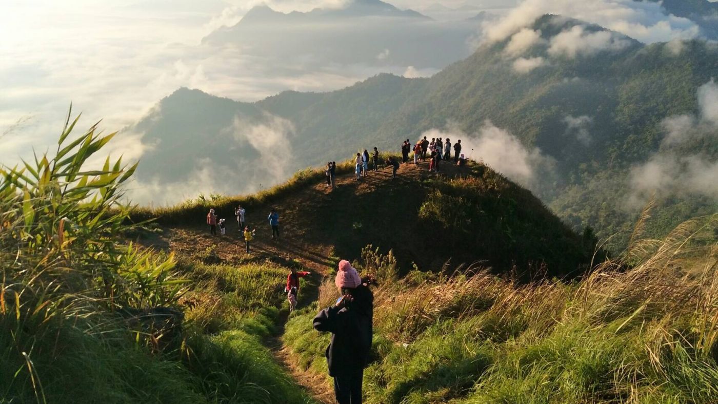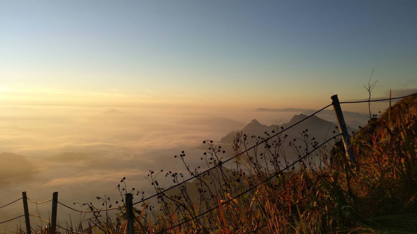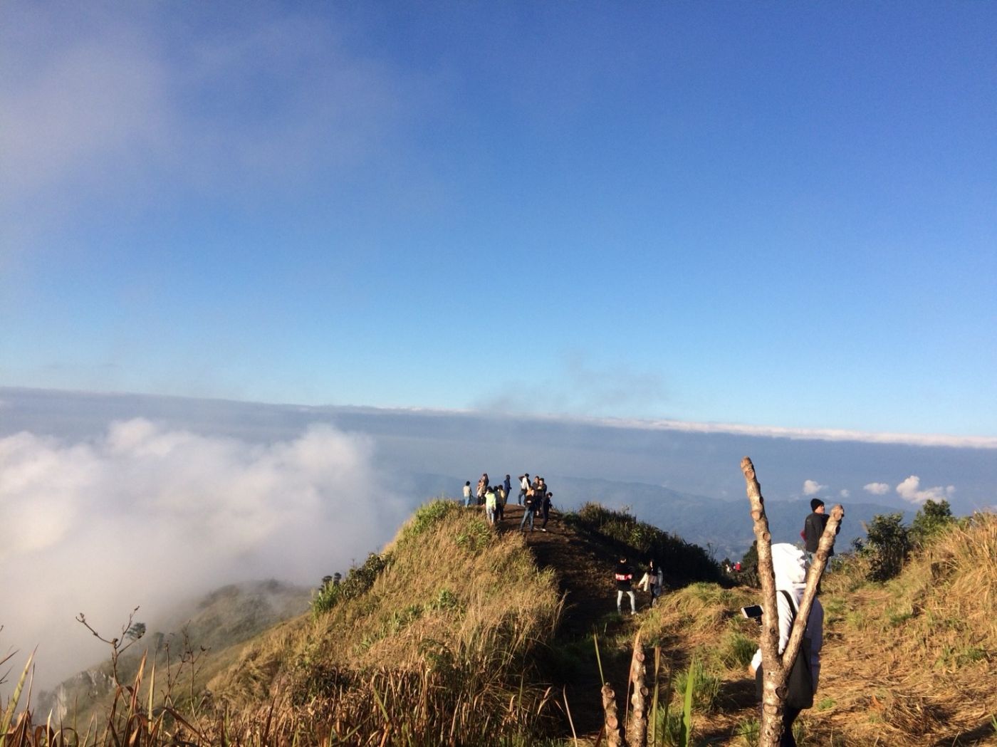 บนภูชี้ฟ้าในตอนเช้านั้นอากาศดีมาก ไกด์แนะนำว่าถ้าหากอยากจับจองพื้นที่เพื่อดูพระอาทิตย์ขึ้น(แบบที่นั่งพรีเมียมพิเศษ)แล้วล่ะก็ ต้องมาถึงก่อนสักประมาณชั่วโมงนึง เราขึ้นไปถึงบนยอดภูประมาณตีห้า สัปหงกอยู่ได้ชั่วโมงกว่าๆเงยหน้าขึ้นมาก็มีนักท่องเที่ยวที่ขึ้นมารอชมพระอาทิตย์ขึ้นด้วยกันเยอะมาก