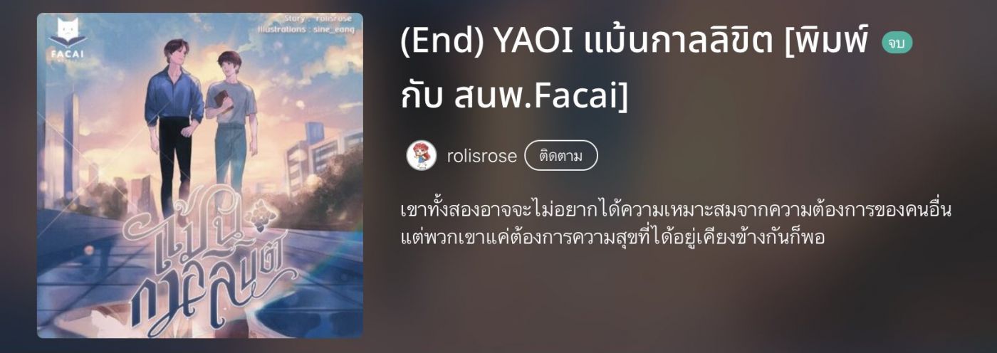 นิยายวายไทยพีเรียดค่ะ การบรรยายนิยายเรื่องนี้อ่านแล้วลื่นไหลมากค่ะ ไรท์แต่งดีมาก ภาษาสวยจริง ๆเนื้อเรื่องจะเริ่มต้นด้วยยุคปัจจุบัน แล้วค่อยย้อนความถึงสิ่งที่เกิดขึ้นในอดีตค่ะ พระเอกกับนายเอกกลับชาติมาเกิดในยุคปัจจุบัน นายเอกจำพระเอกไม่ได้ แต่รับรู้เรื่องราวผ่านหนังสือที่น้องสาวนายเอกเขียนเรื่องความรักและเหตุการณ์ของทั้งสองไว้ ส่วนพระเอกนั้นอธิฐานไว้ว่าขอให้จดจำทุกอย่างได้แล้วเจอกับนายเอกอีกครั้ง ในอดีตพระเอกกับนายเอกรักกัน แต่ด้วยอะไรหลาย ๆ อย่างในสมัยนั้นทำให้ความรักของทั้งคู่เป็นสิ่งที่ต้องห้าม ไม่มีใครยอมรับในเรื่องผู้ชายกับผู้ชายคบกันได้ จริง ๆ พระเอกพยายามบอกนายเอกว่าจะบอกทุกคนเรื่องที่ทั้งสองเป็นคนรักกัน เพื่อที่พระเอกจะได้ไม่ต้องไปหมัั้นกับคนอื่น แต่นายเอกไม่ยอมเพราะกลัวเสื่อมเสียชื่อเสียงตระกูล และกลัวว่าคนมองพระเอกไม่ดี ทั้งคู่เลยตัดความสัมพันธ์กันทั้ง ๆ ที่ยังรักอยู่ สุดท้ายหลังจากที่พระเอกแต่งงาน นายเอกย้ายไปเรียนต่างประเทศ แต่ก็ตัดใจจากกันไม่ได้แม้จะอยู่ห่างกันแค่ไหน ทั้งคู่เลยตรอมใจตาย แล้วมาเจอกันในยุคปัจจุบัน ก็กลับมารักกันเหมือนเดิม ตอนแรกคิดว่าเนื้อเรื่องจะเล่าตัดปัจจุบันสลับอดีตให้เท่า ๆ กัน แต่ว่าไม่ใช่ค่ะ ส่วนมากจะเล่าถึงเหตุการณ์ในอดีตของทั้งสองคนอย่างชัดเจนเลย ส่วนปัจจุบันมีแค่นิดเดียว แต่เพราะว่าพระเอกกับนายเอกจำอดีตชาติของตัวเองได้ กาลปัจจุบันเลยไม่ใช่ปัญหาหรืออุปสรรคที่ทั้้งสองต้องใช้เวลาเพื่อเริ่มต้นความสัมพันธ์กันใหม่อีกรอบ พระเอกรักนายเอกมาก เช่นเดียวกับนายเอกตั้งแต่ระลึกชาติได้ ก็รักพระเอกแบบไม่ต้องสงสัยอะไรเลย ตอนที่อ่านถึงเรื่องทั้งคู่ตรอมใจตายเพราะไม่ได้รักกันนี่เจ็บปวดมาก ๆ รักกันแต่ไม่สามรถอยู่ด้วยกันหรือเปิดเผยความรักได้ ต้องรักกันแบบหลบ ๆ ซ่อน ๆ สุดท้ายก็จบลงด้วยการแยกจากกันตลอดกาล T_T มันทรมาณจริง ๆ และเศร้ามาก ๆ ค่ะ ฮืออ ขอบคุณที่แรงอธิฐานของพระเอกส่งผลให้ทั้งคู่กลับมาครองรักกันเหมือนเดิม ในที่สุดทั้งคู่ก็มีความสุขสักทีนะ ฮืออ happy ending