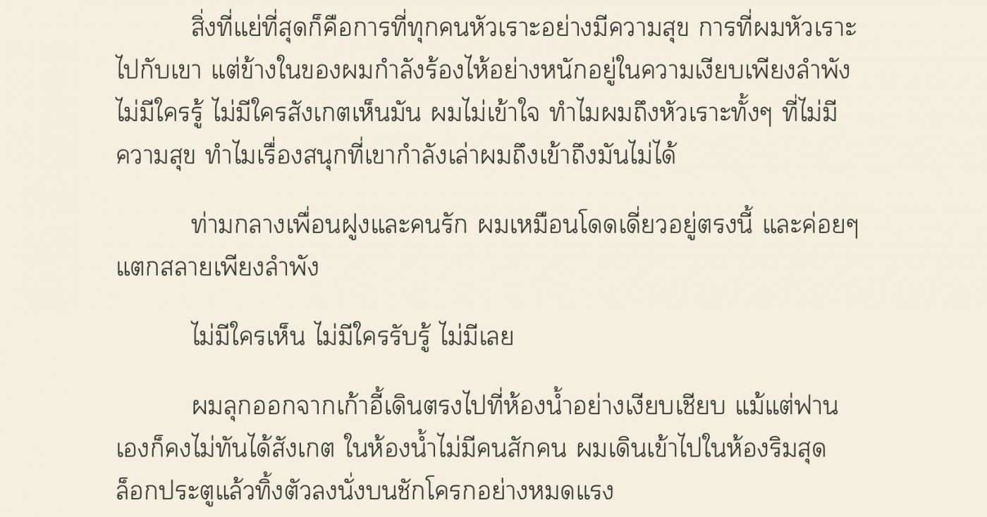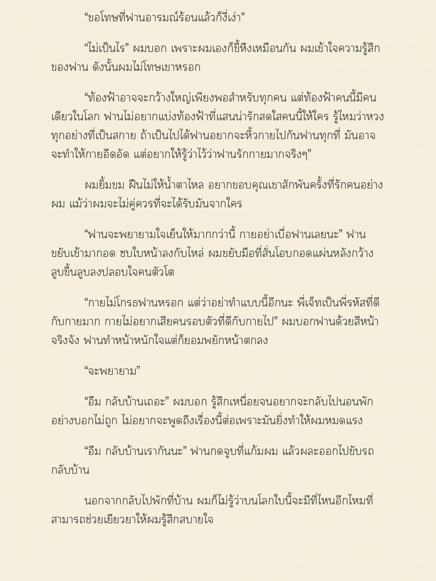 นิยายเรื่องนี้เจอบทนำเข้าไปนี่ได้แต่ร้องอุทานอย่างเดียวเลย ต้องอ่านจริง ๆ แล้วรู้เลยว่าตัวเองจะร้องไห้หนักแค่ไหน สรุปเป็นแบบนั้นจริง ๆ ทำเราร้องไห้ตั้งแต่ตอนแรกจนถึงตอนสุดท้ายเลยค่ะ แล้วช่วงที่น้ำตาแตกเยอะสุดคือช่วงเข้าใกล้กลางเรื่องจนเกือบ ๆ จบเลยจ้า ตาบวมไปหมด ;-; อ่านทีเดียวไม่ได้เพราะรู้สึกอึดอัดและสงสารนายเอกมาก ต้องค่อย ๆ อ่านไป เรื่องนี้สื่อถึงเรื่องโรคและเหตุการณ์ที่มักจะเกิดขึ้นในปัจจุบันได้ดีเลย เป็นเรื่องเกี่ยวกับโรคซึมเศร้าและการต่อสู้ของนายเอก (สกาย) และเรื่องราวความรักกับพระเอก (ฟาน) และการดำเนินชีวิตประจำวันกับเพื่อน ๆ โดยเกี่ยวข้องกับอาการและพฤติกรรมเกี่ยวกับโรคนี้ ไรท์เขียนดีมากกกกกก แบบก.ล้านตัวเลย ฮือออออ เราทำใจนานมากกว่าจะกล้าอ่านเรื่องนี้ พออ่านแล้วทำให้รู้จักโรคและอาการที่มักจะเกิดมากขึ้นไปอีก อ่านจบแล้วดีใจมาก ๆ ที่นายเอกกลับมายิ้มได้จริง ๆ ยกให้เรื่องนี้เป็น the best of the year ของเราที่กล่าวถึงโรคและสังคมปัจจุบันได้แบบตรงเป๊ะเลยจริง ๆ ไม่ต้องห่วงว่าจะ bad end ค่ะ จบดีค่ะ จบแบบว่าน้องค่อย ๆ มีความสุขขึ้นเรื่อย ๆ อยากให้ได้อ่านกันจริง ๆ แล้วจะเข้าใจมากขึ้นว่าอาการเป็นยังไงและเราควรเข้าใจและให้กำลังใจแบบไหน แต่คนที่คิดว่าตัวเองเข้าข่ายโรคนี้หรือเป็นโรคนี้เราไม่แนะนำเด็ดขาดค่ะ