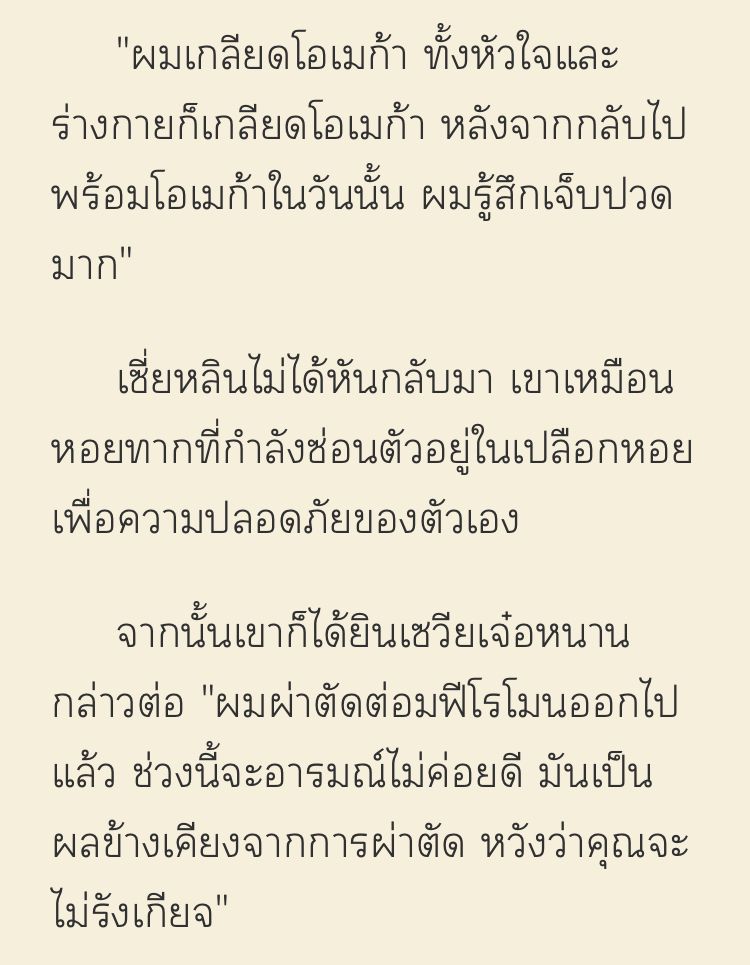 ในใจนายเอกก็รักพระเอกแบบไม่รู้ตัว เพียงแค่กลัวเท่านั้นนายเอกตัดสินใจคบกับพระเอกผลข้างเคียงของการผ่าตัดฟีโรโมนทำให้พระเอกใช้เป็นข้ออ้างอ้อนนายเอกได้นายเอกรู้นายเอกเห็นแต่ไม่ทำอะไร555555 ปล่อย ๆ ให้พระเอกแกล้งทำไป ทีนี้พระเอกอ้อนเข้ามาก ๆ เลยล่อพระเอกไปบ้านนายเอก พระเอกคงหายปวดหัวขึ้นมาทันที นายเอกยังมีความกังวลอยู่ ถามพระเอกเรื่องลูกออกไป พระเอกบ่น ๆ ไป เรื่อย บ่นออกมาเป็นชุด บ่นจนไปถึงเรื่องตอนเด็ก ๆ ทำให้นายเอกจำได้ขึ้นว่า พระเอกคือเด็กผู้หญิงน่ารัก ๆ ที่คล้ายโอเมก้า และเคยซื้อไอติมให้กินในวันฝนตก