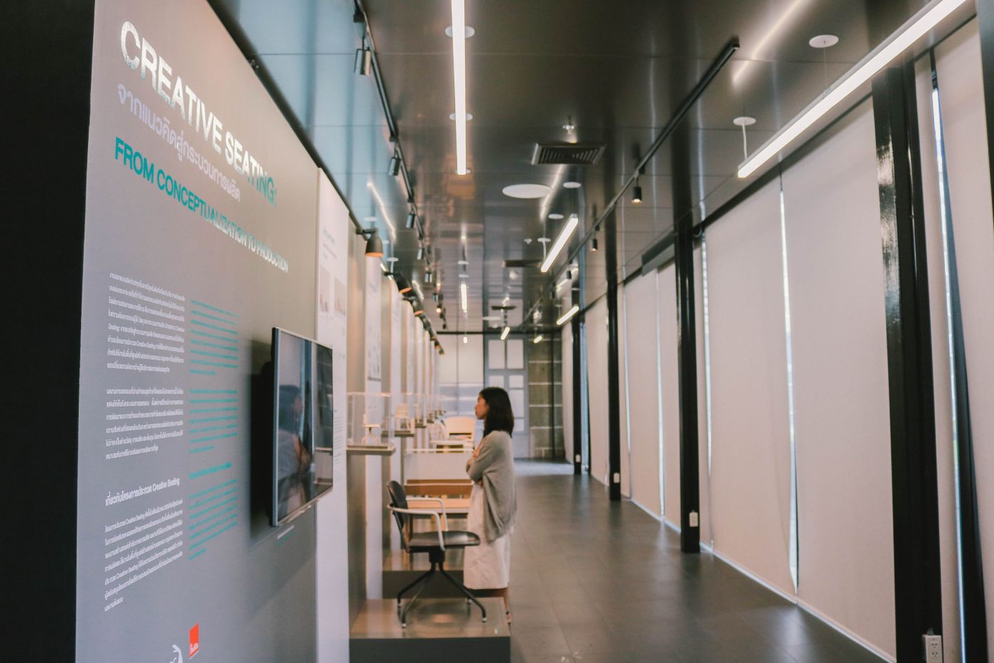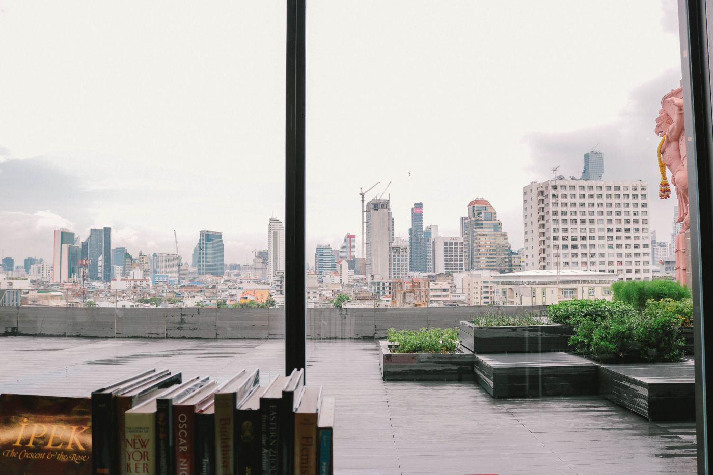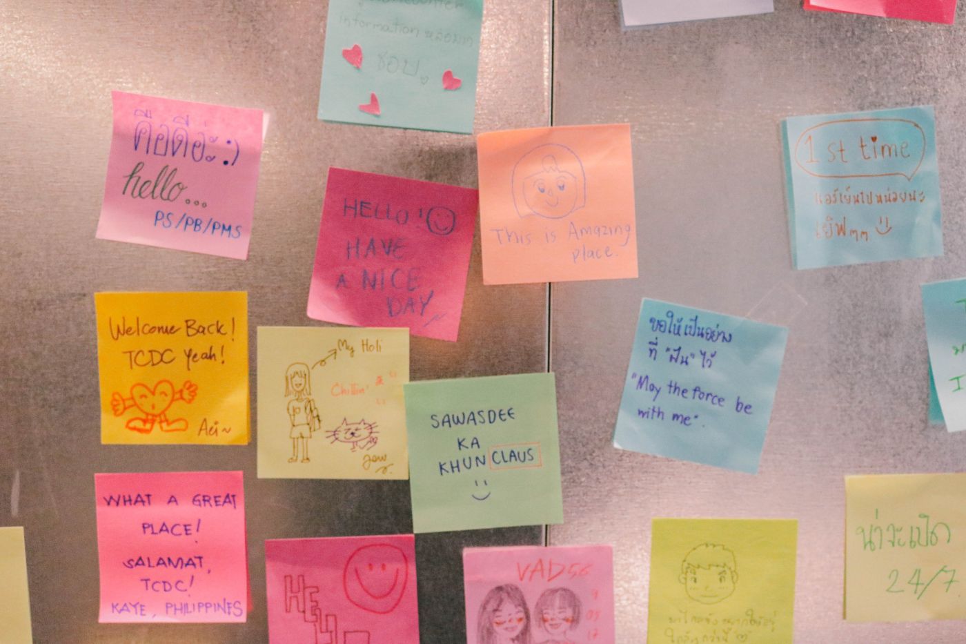จริงๆ มีมุมสำหรับเขียนโพสอิทไว้แปะบนผนังด้วย เขียนอะไรก็ได้ เขียนๆๆถัดเข้ามาอีกหน่อย (ยังจำห้องเเรกได้อยู่ใช่มั้ย ฮ่าๆๆ รู้สึกพาเเวะเยอะ) ก็จะมีที่นั่งริมกระจกสามารถมองลงไปเห็นชั้นสี่ที่เป็นชั้นที่รวบรวมบรรดาหนังสือเกี่ยวกับงานออกแบบทั้งหลาย (ส่วนมากเป็นอังกฤษ แต่ก็มีไทยเหมือนกัน)