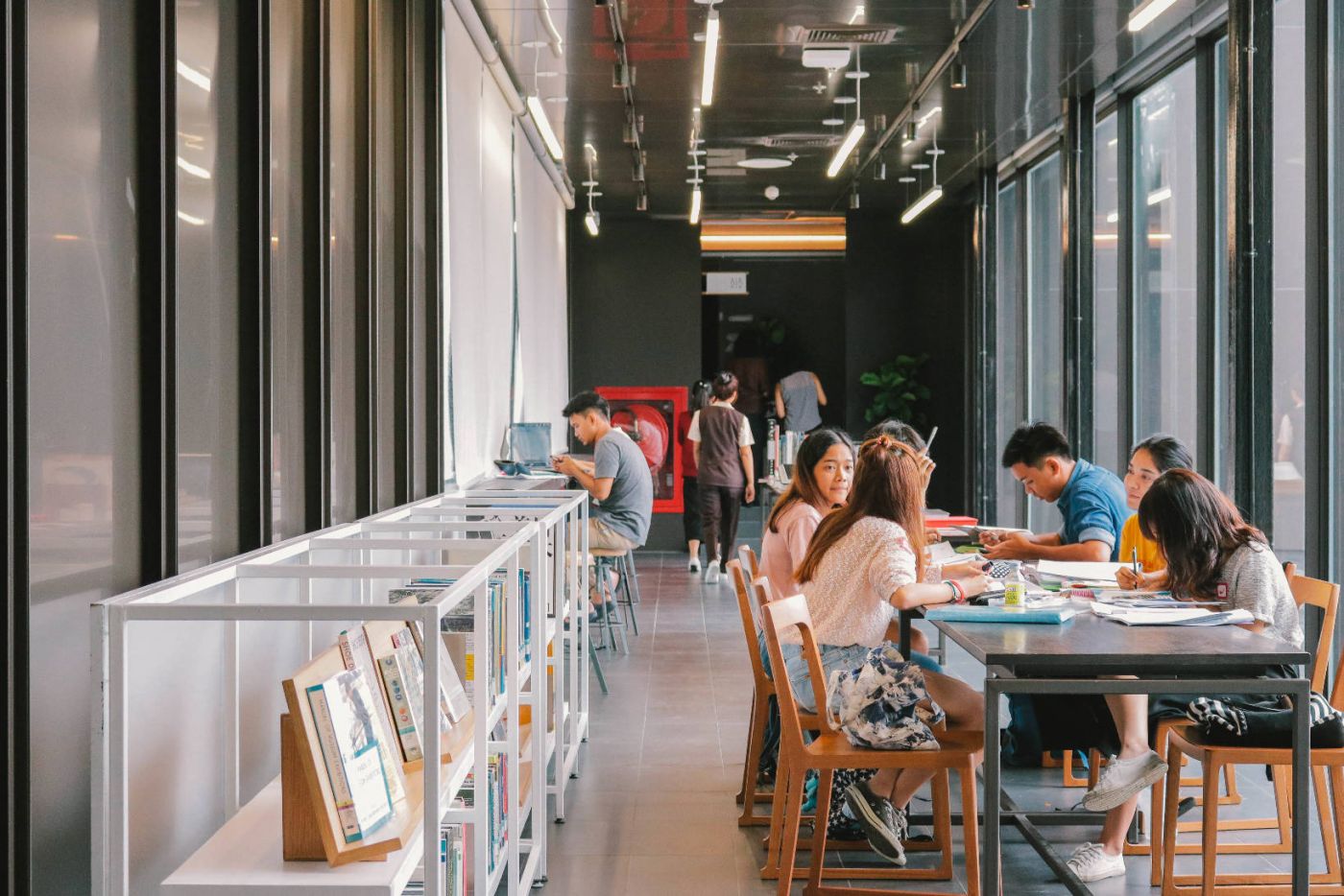 ลงลิฟต์ (ซ้ายมือรูปก่อนหน้า) มาก็จะเป็นชั้นที่นั่งทำงานได้อีก เเละมีหนังสือให้เลือกอ่านด้วย