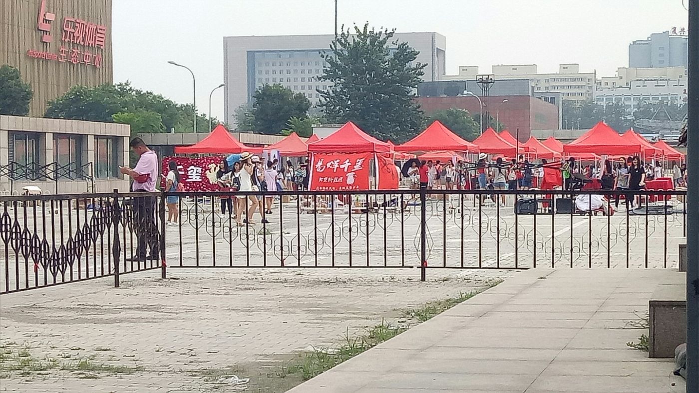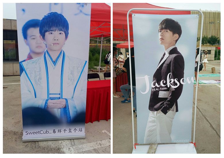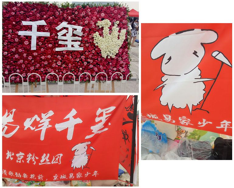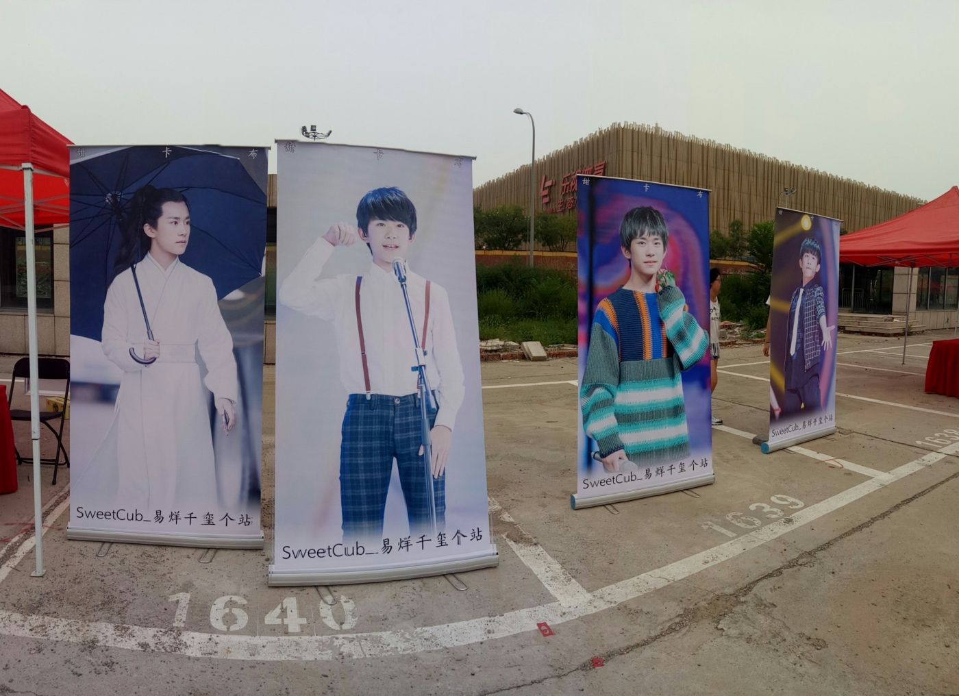 สีแดงคือสีประจำตัวของอี้หยางเชียนซี แต่ละบ้านเอาสแตนดี้รูปเชียนซีออกมาตั้งประชันกันสุดฤทธิ์ และยังมีพวกแบนเนอร์ไวนิลที่กางไว้กับพื้นบ้าง แขวนไว้กับเต้นท์บ้างอีกหลายสิบอัน
