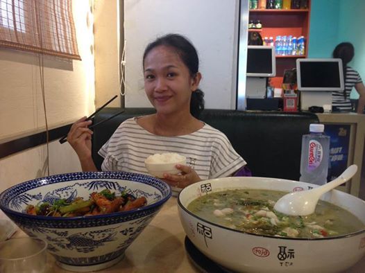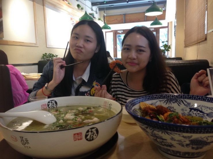 หมิวกับนิ้งบอกว่ามันคือร้านอาหารฉงชิ่ง อ้าว...แล้วจะรออะไรกันล่ะ เหล่าสะใภ้ฉงชิ่งเฮโลกันเข้าไปในร้านทันที ยังไม่รู้หรอกว่าจะมีอะไรกินได้รึเปล่า ดูเมนูแล้วราคาเอาเรื่องอยู่เหมือนกัน เลยสั่งไปแค่สองอย่าง เป็นต้มยำปลากับผัดพริกกุ้งไก่ทอด ยกมาเสิร์ฟแล้วถึงได้รู้ว่าทำไมราคาจึงสูงกว่าร้านอาหารอื่นที่เคยกินมา เพราะชามอย่างยักษ์!