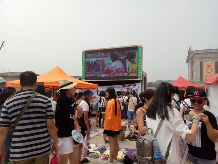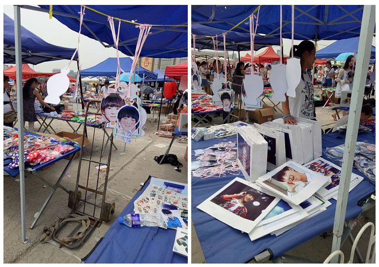 ตอนไปถึงเขาแจกของซัพพอร์ทกันเกือบหมดแล้วล่ะค่ะ (เอิ๊ก) เลยไม่ได้เก็บภาพบรรยากาศหน้างานตอนที่กำลังพีคๆ มาให้ดู แต่วันนี้เห็นเต้นท์สีอื่นนอกจากสีแดงแซมขึ้นมาบ้างแล้ว เช่น เต้นท์สีส้มซึ่งเป็นบู้ทของบ้านแฟนคลับวง มีการเช่ารถ LED มาเปิดฉาย VTR ของ TFBOYS แล้วยังเปิดให้แฟนๆ เข้าไปเซ็นชื่อเขียนข้อความแสดงความยินดีบนแบนเนอร์ด้วย แล้วก็เต้นท์สีน้ำเงินของหวังจุนไค ส่วนหวังหยวนนั้น เราคงไม่มีดวงกับน้องจริงๆ เพราะเห็นกลุ่มลูกโป่งสีเขียวกลุ่มใหญ่กับรถ LED ของน้องอยู่นะ แต่ถ่ายไม่ทัน ระหว่างนั้นมีการ์ดในเครื่องแบบ 5-6 คนไล่ตรวจดูตามบู้ทต่างๆ ซึ่งไม่รู้จริงๆ ว่าตรวจอะไรกันแน่? เพราะเห็นบางบู้ทเก็บของขึ้น บางบู้ทไม่เก็บ พอการ์ดจากไปบู้ทที่เก็บก็เอากลับมาวางใหม่ หาคำตอบไม่ได้จริงๆ