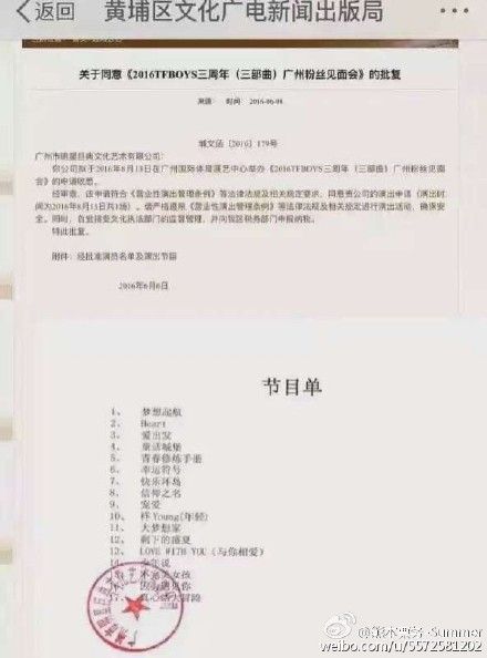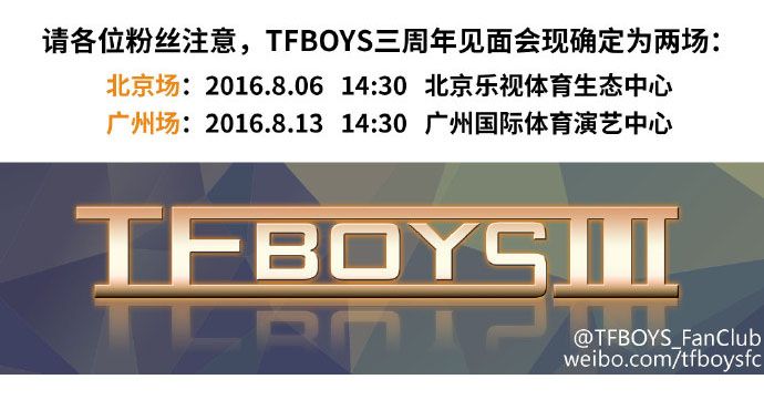 มีข่าวลือเรื่องคอนเสิร์ตครบรอบของ TFBOYS ว่าจะจัดที่กว่างโจววันที่ 13 สิงหาคม เป็นข่าวลือที่มาพร้อมเอกสารและตราประทับ แถม Set list ในคอนอีกต่างหาก ดูน่าเชื่อถือผุดๆ