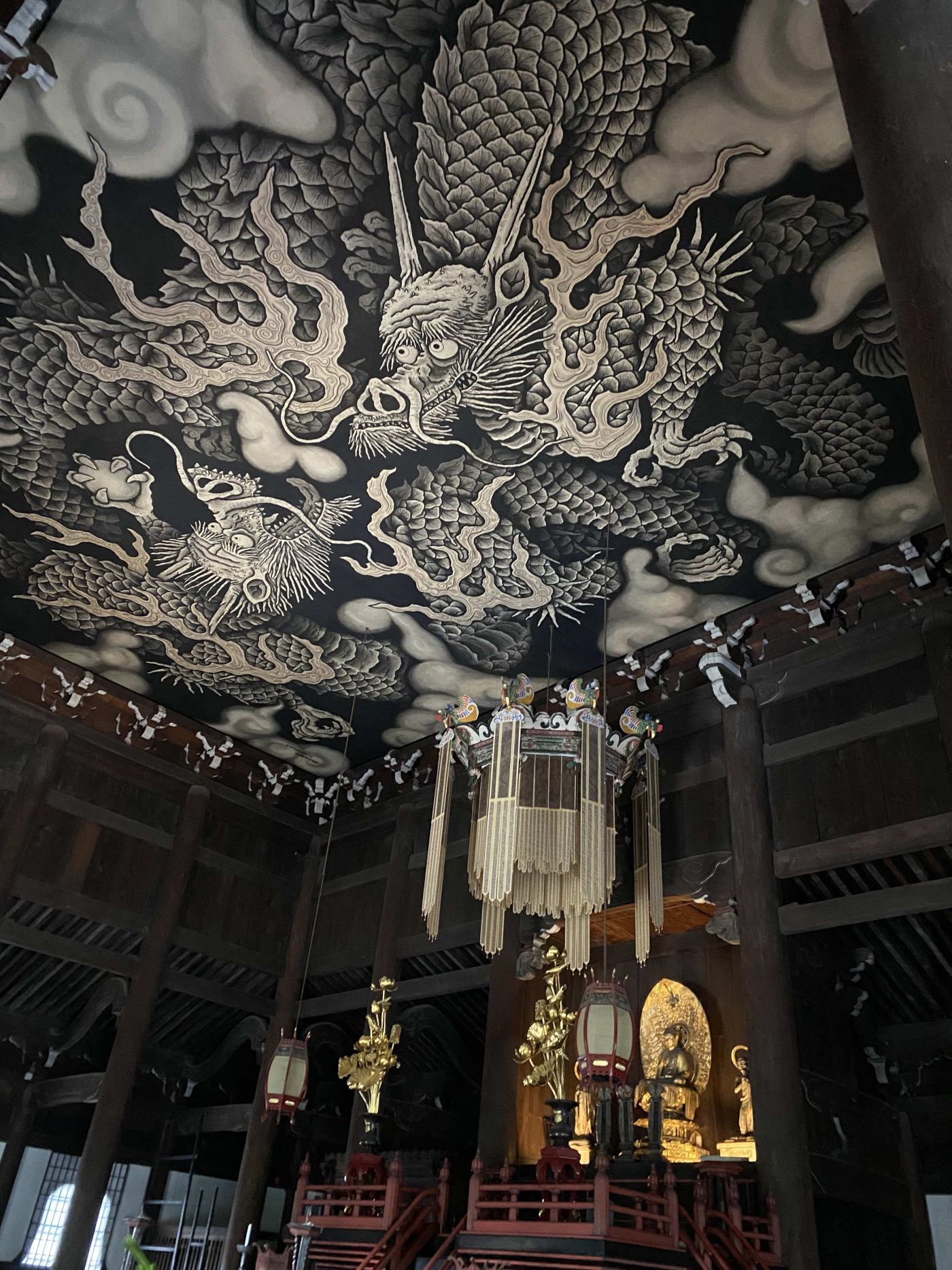 ในส่วนของวัดยังมีศาลาที่พระพุทธรูปอยู่ ด้านบนของเพดานมีภาพวาดมังกรตัวใหญ่ตัดกับฉากหลังที่เป็นสีดำ ดูขลังและอลังการมาก